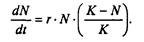 . Это уравнение представляет собой модель роста популяции, ограниченного внутривидовой конкуренцией. Суть этой модели в том, что константа R в уравнении (7.60) заменена на фактическую скорость воспроизводства, т е.