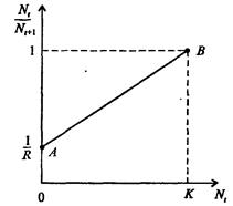 На рис. 7.37 показана простейшая возможная зависимость скорости воспроизводства от численности популяции. Точка А отражает ситуацию, в которой численность популяции близка к нулю, конкуренция при этом практически отсутствует, и фактическую скорость воспроизводства вполне можно описывать параметром R в его первоначальном виде. Следовательно, при низкой плотности популяции уравнение (7.60) вполне справедливо. В преобразованном виде оно выглядит так: