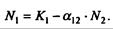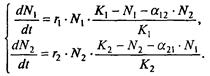 в этом случае называют коэффициентом конкуренции. Обозначим ее α12. Таким образом, чтобы отразить суммарное воздействие на вид 1, надо в логистическом уравнении в числителе дроби вместо N записать N1 + α12∙N2. Аналогично получается уравнение для исследовании численности второй популяции. В результате получаем систему двух дифференциальных уравнений: