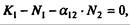 Так как мы имеем дело с двумя различными популяциями, то введем соответствующие обозначения. Пусть N1 - численность первой популяции, a N2 - второй. Предельные плотности насыщения и максимальные врожденные скорости роста популяций обозначим соответственно K1, К2, r1 и r2, рис. 7.43.