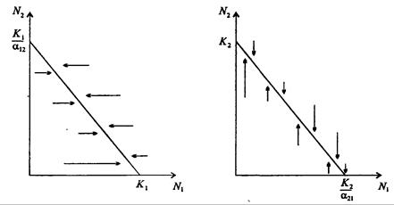 Таким образом, получено уравнение изоклины, которое, как можно заметить, является уравнением прямой в плоскости (N1, N2). Вверх и вправо от изоклины из-за высокой численности обеих популяций численность вида 1 снижается, в противоположных направлениях - повышается. Аналогично можно построить изоклину для вида 2. На рис. 7.44 построены соответствующие изоклины, и показано изменение численности популяций.