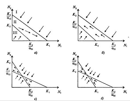 Рис. 7.45. Результаты конкуренции, полученные с помощью модели Лотки-Вольтерры при различных параметрах. На рисунке а в зоне I численность обеих популяций падает; в зоне II - численность первой популяции растет, второй - уменьшается; в зоне 111 - численность обеих популяций увеличивается