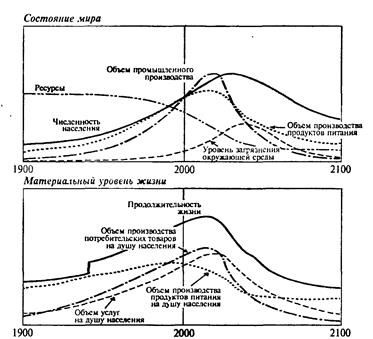 Такие модели, получившие название глобальных (всеохватывающих), начали возникать в 70-х годах нашего века. Наиболее известны модели МИР-1, МИР-2, МИР-3, сформулированные и изученные группой сотрудников Массачусетского технологического института (США) под руководством Д.Х.Медоуз и Д.Форрестера. Работы были начаты по поручению «Римского клуба» - международной неправительственной группы выдающихся государственных деятелей, ученых, бизнесменов. Результаты в свое время произвели в западном мире сенсацию, ибо большинство сценариев возможного развития событий вели к результатам, которые можно назвать концом света (разумеется, с точки зрения человечества). Вместе с тем авторы не раз подчеркивали, что речь идет не о заведомо предопределенном будущем, а о выборе путей развития человечества, среди которых есть и ведущие к стабильности.