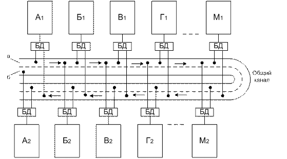 Первая из них заключается в том, что общий канал (рис. 2) прокладывается так, чтобы он дважды проходил мимо всех абонентских систем. Далее происходит следующее. В первой сети (полоса а, стрелки) общий канал (в верхней его части) вначале собирает информацию, передаваемую абонентами A1 - M1. Затем в нижней части канала осуществляется раздача полученной информации абонентам A1 - M1. Аналогично этому абоненты А2 - М2 передают информацию через моноканал, созданный на основе частотной полосы б.