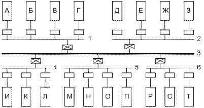 Второй способ повышения скорости передачи информации заключается в создании иерархии моноканалов. Сущность этого способа иллюстрируется схемой, показанной на рис. 8. В сети функционирует 18 абонентских систем (А - Т). Однако они подключены не к одному, а к шести моноканалам (1—6).