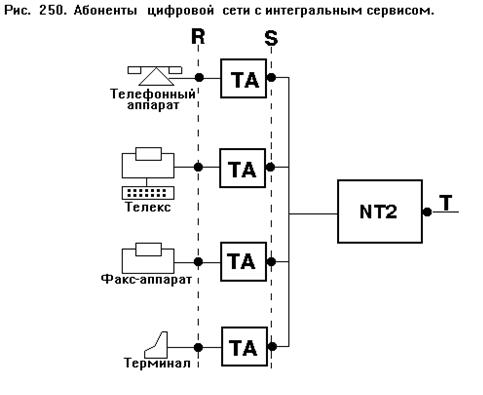 В качестве терминального оборудования могут выступать самые разнообразные устройства: телефонный аппарат, телекс, факс-аппарат, дисплей, X-terminal (предназначенны для работы с изображениями), полиэкранный терминал, многофункциональный терминал (работает с любыми типами данных, в том числе - с речью и изображениями), персональный компьютер, мини-компьютер, суперкомпьютер и т.д. Включается это оборудование в информационную сеть поодиночке либо группами. Последний случай, в основном, используется тогда, когда рассматриваемое оборудование очень просто и требует выполнения не только функций нижних уровней, но и преобразование интерфейсов. Так, в Цифровой Сети с Интегральным Обслуживанием (ЦСИО) терминальное оборудование может иметь различные интерфейсы R, которые при помощи терминальных адаптеров преобразуются в стандартный для этой сети интерфейс S, (рис.250).