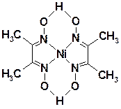 Здесь точками обозначены внутримолекулярные водородные связи. Этот плоский (квадратный) комплекс - бис(диметилглиоксимато)никель(II), представляет собой малорастворимое в воде соединение красного цвета; применяется для определения никеля(II).