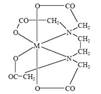 В кислом растворе ЭДТА (H4edta) протонируется, образуя катион – кислоты Н5edta+ и H6edta2+, если edta4– - анион четырехосновной кислоты. Формула комплексона показывает, что анион edta4– является потенциально декадентатным: координация может осуществляться через два атома азота и восемь атомов кислорода, считая четыре "карбоксильных" и четыре "карбонильных". Однако пространственная структура соединения такова, что дентатность не может быть выше шести – в координации могут участвовать два атома азота и четыре "карбоксильных" атома кислорода. При этом образуются пять пятичленных металлоциклов, что приводит к исключительно высокой устойчивости комплексонатов.