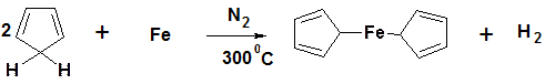 В 1951 г. Английскими химиками Посоном и Кили был открыт ферроцен – Fe(C5H5)2: желтое кристаллическое вещество. Оно легко получается при нагревании циклопентадиена с восстановленным железом в атмосфере азота при 300оC: