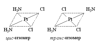 Геометрическая изомерия. Этот вид изомерии обусловлен различным пространственным расположением лигандов разнолигандных комплексов во внутренней координационной сфере: