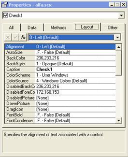 | Для каждого объекта существуют свойства и методы, управляющие его внешним отображением (вкладка Layout в окне Properties), взаимодействием с источником данных для этого объекта (вкладка Data), методами обработки событий от других элементов или связанных с действиями пользователя (вкладка Methods), прочие свойства (вкладка Other). В выделенном на рисунке окне может работать построитель выражений (кнопка fx) для определения значения свойства (если в этом есть необходимость). Если для метода указано [Default], то выполняются действия по умолчанию для каждого из методов. Если требуется ввести собственные действия, после двойного щелчка открывается окно для ввода программы, назначаемой данному методу, помимо действий, выполняемых по умолчанию. |