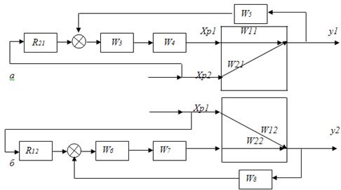 У розрахунку системи пов’язаного регулювання поділяють на автономні АСР (див. рис. 4.11). Кожну таку автономну систему розраховують як комбіновану згідно із принципом інваріантності, тобто знаходять настроювання регулятора і після цього визначають параметри динамічного компенсатора. Збуренням для автономної АСР, зображеної на рис.4.11.а, буде навантаження Хр2 а показаної на рис.4.11.б - Хр1. Таким чином, такі системи досліджують по каналу відповідно Хр2→ y1 і Хр1→ y2.