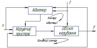 Контур, що складається з керуючого пристрою і об'єкта керування, є основним контуром і становить звичайну неадаптивну САК. Адаптер дістає інформацію про вхідну дію x, збурення f, вихідну величину y і діє на керуючий пристрій основного контуру. Отже, адаптивна САК, крім основного контуру, має контур адаптації. Для цього контуру об'єктом керування є вся основна САК.
