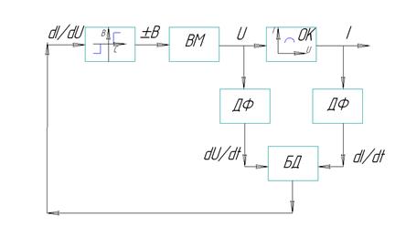 Вона складається з двох диференціаторів, блока ділення, що визначає похідну dI/dU і релейного елемента РЕ, що дає знак похідної. Залежно від знака похідної виконавчий механізм ВМ, забезпечує рух об’єкта керування в бік екстремуму. Під час проходження через екстремум знак похідної змінюється, релейний елемент РЕ перемикається і ВМ реверсується, що забезпечує повернення системи до точки екстремуму.