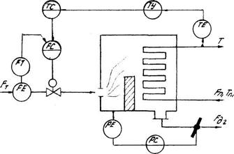 Якщо особливі вимоги висуваються до якості регулювання температури продукту після теплообмінника, а в піч надходять великі збурення з боку подавання як палива, так і продукту, то використовують каскадну систему регулювання з допоміжною координатою за температурою нагрітих газів над перевальною стінкою (рис. 6.10).