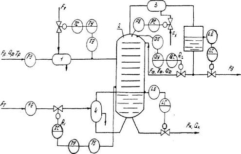 Розглянемо принципи автоматизації процесу ректифікації на прикладі тарілчастої ректифікаційної колони, призначеної для розділення бінарної суміші, яка складається з теплообмінника 1 для підігрівання свіжого розчину, колони 2, дефлегматора 3 і виносного кип’ятильника 4 (рис. 7.1).