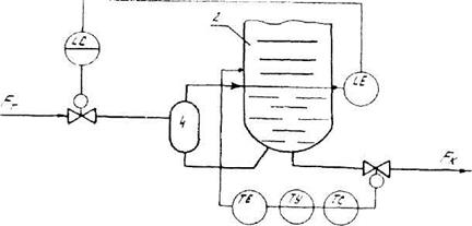 Принцип регулювання грунтується на тому, що рівень кубової рідини змінюється залежно від температури в нижній частині колони. Причому рівень кубової рідини стабілізується зміною витрати теплоносія, який надходить на кип'ятильник 4, а температура - зміною витрати кубової рідини (рис. 7.6).