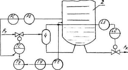 Якщо пари в дефлегматорі конденсуються за рахунок випарювання холодоносія (аміаку, фреону та ін.), то поліпшити якість регулювання можна зміною витрати парів холодоносія, які виходять із дефлегматора. Це приводить до швидкої зміни тиску та температури кипіння холодоносія, а відповідно інтенсивності конденсації пари цільового продукту в дефлегматорі. У цьому разі рівень рідкого холодоносія стабілізується (рис. 7.12).