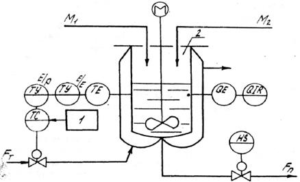Рис. 9.6 Схема одно контурного регулювання реактором періодичної дії: 1 – програмний задавач; 2 - реактор