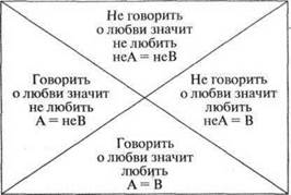 Возьмем для примера исходное выражение «Не говорить о любви — значит не любить» (неА = неВ) и распишем его по квадрату.