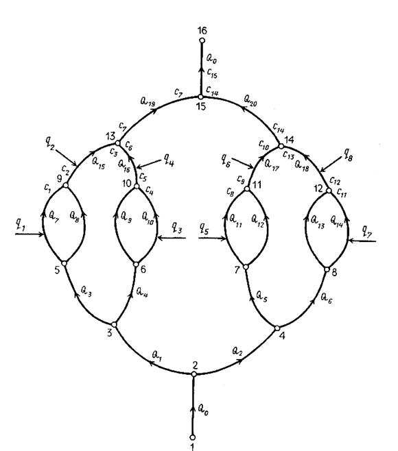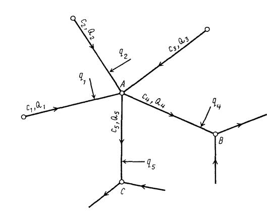не входят и учитываются в следующих по струе узлах, для которых они являются источниками на поступающих струях. Например, источники q4 и q5 (рис. 7.1) учитываются в уравнениях узлов В и С; к уравнение (7.9) для узла А они не входят.