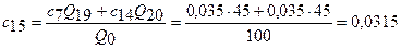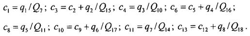 "Пустыми" являются узлы 1,2, 3, 4, 5, 6, 7, 8; их число Nn = 8. Число узловых уравнений в соответствии с формулой (6.10) – E = N - Nn Þ Е = 8. Неизвестными являются все указанные на схеме содержания - от с1до с15; их число Кс = 15. Имеем Е < Кс, что означает необходимость введения дополнительных соотношений, принимаемых по формуле (7.11) -