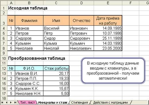 Имеется таблица, содержащая фамилии, имена, отчества сотрудников и дату поступления на работу каждого из них (заполняется вручную с клавиатуры). Требуется создать новую таблицу, содержащую фамилию, инициалы и стаж работы каждого сотрудника (новая таблица будет формироваться автоматически, используя информацию в ячейках исходной таблицы).