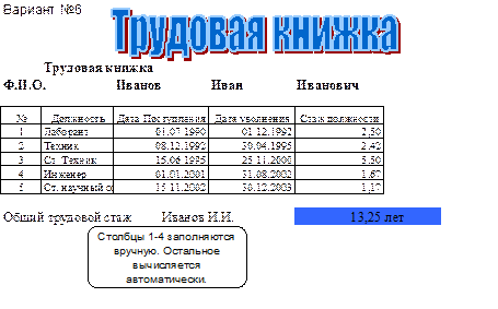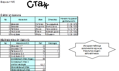 4 Лист 2 (Инициалы и стаж) – общее задание: создание инициалов и определение стажа работы сотрудников;
