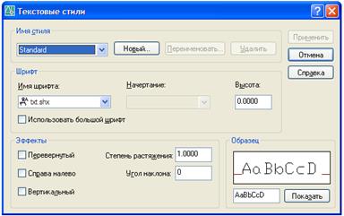 В результате открывается окно настройки стилей текста (рис. 5). В поле Имя стиля (Style Name) указывается имя стиля. В поле Имя шрифта (Font Name) выбирается гарнитура шрифта, причем рекомендуется выбирать гарнитуры с иконкой «циркуль» (расширение .shx). В поле Высота (Height) выбирается высота шрифта – стандартные значения: 3,5 5 7 10 и т.д. В поле Степень растяжения (Width Factor) задаётся плотность букв. Рекомендуется выбирать в диапазоне 0,6¼0,8. В поле Угол наклона (Oblique Angle) определяется угол наклона шрифта, отсчитываемый от вертикали. Таким образом, для стандартного шрифта необходимо выбрать угол 15°.