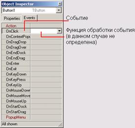Чтобы приступить к созданию функции обработки события, сначала надо выбрать компонент, для которого создается функция обработки события. Выбрать компонент можно в окне Object Inspector или щелчком на изображении компонента в форме. После этого в окне Object Inspector нужно выбрать вкладку Events (События).