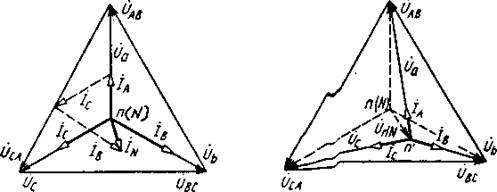 При включении нейтрального провода и несимметричной нагрузке (сопротивлением нейтрального провода пренебрегаем) потенциал нейтральной точки потребителя п равен потенциалу нейтральной точки N генератора. Следовательно фазные напряжения потребителя равны соответствующим фазным напряжениям генератора, а напряжение между нейтральными точками UnN=0.