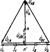 Рис.4 Рис. 5 Короткое замыкание одной фазы потребителя электроэнергии, соединенного звездой без нейтрального провода, следует рассматривать как частный случай несимметричной нагрузки, при котором напряжение на короткозамкнутой фазе потребителя становится равным нулю, а напряжение на двух других фазах увеличивается до значений, равных линейным напряжениям (рис. 6). Нейтральная точка п на векторной диаграмме смещается в этом случае в вершину треугольника линейных напряжений (и'), соответствующую короткозамкнутой фазе. При этом напряжение £/#«' между нейтральными точками генератора и потребителя становится равным фазному напряжению питающего генератора.