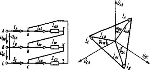 Углы сдвига по фазе между векторами фазных напряжений, UAB, UBC, UAC, и соответствующих фазных токов Iab, Ibc, Iac определяются фазными сопротивлениями потребителя: