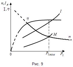 Рабочие характеристики электродвигателя постоянного тока с параллельным возбуждением представлены на рис. 8. Из этих характеристик видно, что частота вращения п электродвигателей с параллельным возбуждением с увеличением нагрузки несколько уменьшается. Зависимость полезного момента на валу двигателя от нагрузки Р2 представляет собой почти прямую линию, так как момент этого двигателя пропорционален нагрузке на валу: М = 9550Р2/п. Искривление указанной зависимости объясняется некоторым снижением частоты вращения с увеличением нагрузки. При Р2 = 0 ток, потребляемый электродвигателем, равен току холостого хода. При увеличении мощности, развиваемой электродвигателем, ток якоря увеличивается приблизительно по той же зависимости, что и момент нагрузки на валу, так как при условии Ф = const ток якоря пропорционален моменту нагрузки. КПД электродвигателя определяют как отношение полезной мощности на валу к мощности, потребляемой из сети.