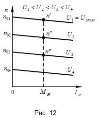 С изменением подводимого напряжения частота вращения идеального холостого хода n0 в соответствии с приведенным ранее выражением изменяется пропорционально напряжению. Так как сопротивление цепи якоря остается неизменным, то жесткость семейства механических характеристик не отличается от жесткости естественной механической характеристики при U = Uном.