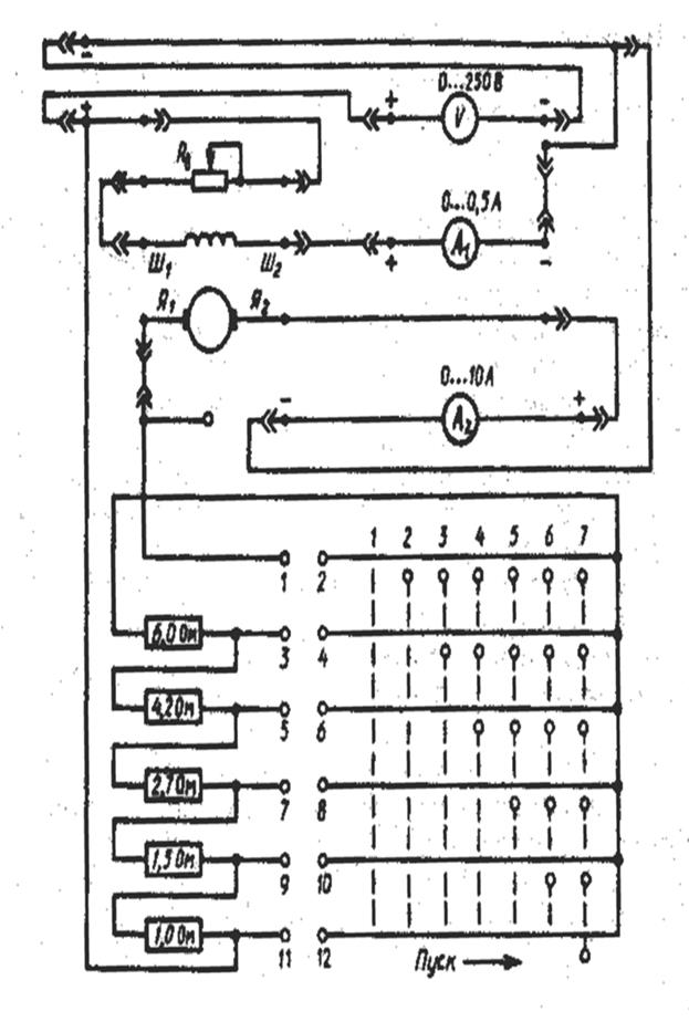 3. Провести пуск электродвигателя плавным переключением пускового реостата из положения «1» в — «7» с выдержкой времени в каждом промежуточном положении в течение 1 ...1,5 с. После окончания процесса пуска, когда частота вращения якоря двигателя принимает установившееся значение, пусковой реостат полностью должен быть выведен (рукоятка пускового реостата должна быть в крайнем правом положении — положении «7»).