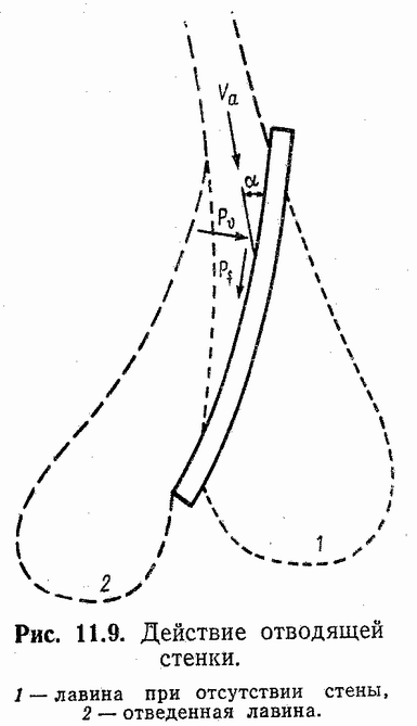 Дамбы и стенки эффективны, когда речь идет о рыхлых лавинах, однако при защите от пылевой лавины они практически бесполезны. Отводящие дамбы могут эффективно применяться лишь там, где есть достаточно места, куда можно направить лавины, не рискуя причинить ущерба. Последнее обстоятельство часто ограничивает применение сооружений этого типа. Отвод масс снега должен осуществляться постепенно, в противном случае лавины будут перекрывать и засыпать сооружения. Установлено, что угол а между направлением лавины и положением отражающего сооружения не должен превышать 20° в случае земляной насыпи и 30° в случае стенки. В противном случае эффективность лавиноотводящих сооружений резко уменьшается.