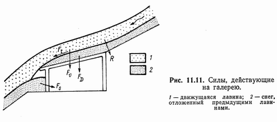 Они в основном применяются на железных дорогах, автомагистралях; при проектировании зданий они иногда конструктивно включаются в них. Шерер [26] отмечает высокую стоимость галерей, а также тот факт, что для их качественного проектирования необходимы надежные оценки как ширины лавины, так и нагрузок, которые будет испытывать сооружение под действием движущегося снега, когда на него действуют следующие силы (рис. 11.11):