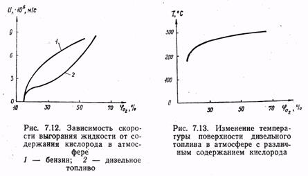 Влияние концентрации кислорода в атмосфере. Большинство жидкостей не способны к горению в атмосфере с содержанием кислорода менее 15%. С повышением концентрации кислорода выше этого предела скорость выгорания возрастает (рис. 7.12). В атмосфере, обогащенной кислородом, горение жидкости протекает с выделением большого количества сажи в пламени и наблюдается интенсивное кипение жидкой фазы. Для многокомпонентных жидкостей (бензин, керосин и т. п.) температура поверхности с увеличением содержания кислорода в окружающей среде возрастает (рис. 7.13).