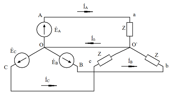 Нулевой провод – провод, соединяющий нулевую точку генератора О и нулевую точку нагрузки О`. Ток текущий по нулевому проводу называют нулевым током и обозначают Í0.