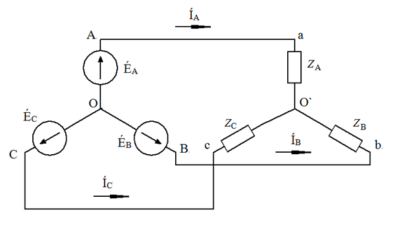 Токи, текущие по линейным проводам, называют линейными токами и обозначают ÍA, ÍB, ÍC. Положительное направление линейных токов всегда от генератора к нагрузке. Направление нулевого тока Í0 всегда от нагрузки к генератору.