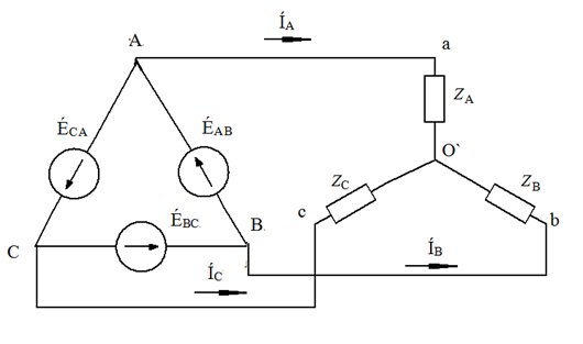 В этой схеме кроме линейных токов нагрузок ÍA, ÍB, ÍC появляются фазные токи нагрузок Íab, Íbc, Íca, протекающие по треугольнику нагрузок.