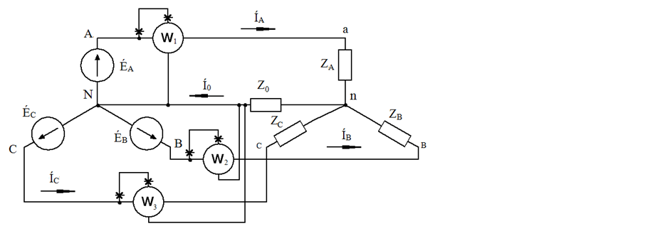 Для измерения активной мощности в трёхфазной четырёхпроводной системе в общем случае, т. е. при неравномерной нагрузке, необходимо три ваттметра, включённых по схеме рис. 27