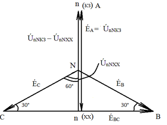 Из рис. 30 видно, что вектор ÚnNХХ будет направлен в противоположную сторону по отношению к Е́А и равен его половине:
