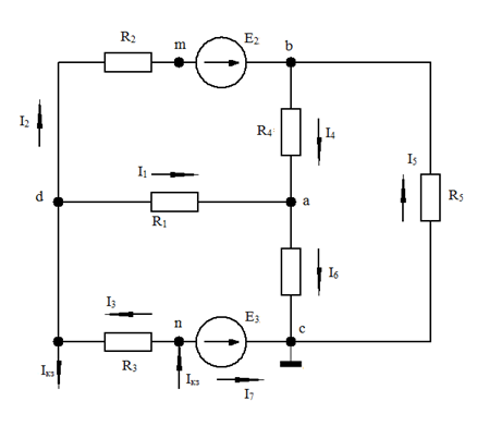 Пусть φс = 0, а значит φn = -Е3. Теперь известны потенциалы двух узлов, поэтому достаточно составить три уравнения для узлов а, b, d.