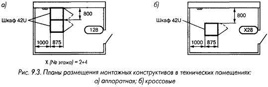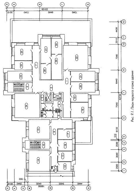 Структурированная кабельная система устанавливается в 4-этажном здании офисного назначения, отдельные этажи которого имеют идентичную планировку, изображенную на рис. 9.1 на примере первого этажа. Высота этажа в свету между перекрытиями составляет 3,5 метра, общая толщина междуэтажных перекрытий равна 50 см.
