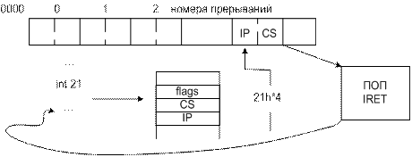 Процедура обработки прерывания обязательно должна закончится процедурой IRET, после которой считываются значения flags, CS, IP.