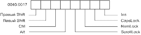 2 байта, расположенные в ячейках памяти с адресами памяти 0040:0017 и 0040:0018 содержат биты, отражающие статус клавиш-переключателей.
