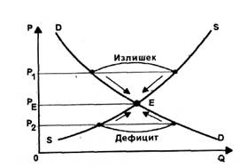 Таким образом, «невидимая рука» рынка поддерживает рыночное равновесие, воздействуя через рыночную цену на силы спроса и предложения.