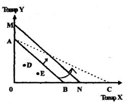 Бюджетная линия сместится вправо (МN). Снижение дохода соответственно приведет к параллельному сдвигу бюджетной линии влево.